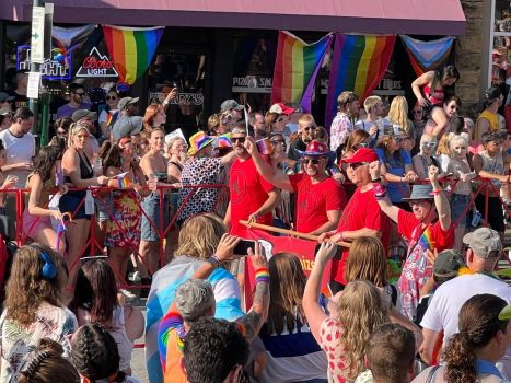 The crowd swells on either side of Fayetteville’s Dickson Street to encourage University of Arkansas workers Matt Stanley (from left), Bret Schulte, Ted Swedenburg and Ben Pollock, repping for Local 965 in the 19th annual NWA Pride Parade on June 24, 2023. Photo by Megan Lewis-Reed