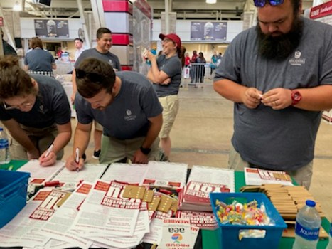Previous Image Next Image 5 staffers at near table Several U of A staff members examine the brochures or sign up for the Local 965 mailing list May 19 at the 2022 Staff Appreciation Picnic at Reynolds Razorback Stadium.