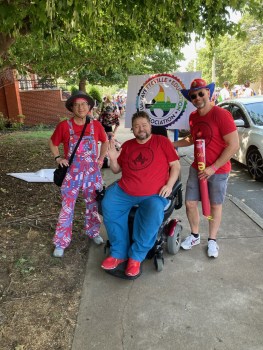 Previous Image Next Image Ben Hershel waving Bret 062423 by Matt Stanley Local 965 Vice President Ben Pollock (from left), President Hershel Hartford and Past President Bret Schulte enjoy the shade as paraders line up June 24, 2023, for the 19th annual NWA Pride Parade. Photo by Matt Stanley
