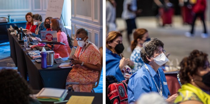 Ben Pollock of UA-Fayetteville Education Association / Local 965 takes the minutes July 3, 2022, (left) of the morning Arkansas caucus meeting July 3, 2022, at Chicago’s Drake Hotel. At right, Pollock listens to debate July 4, 2022, at the NEA Representative Assembly at Chicago’s McCormick Place convention complex. Photos by Kyle Leyenberger, AEA communications director.