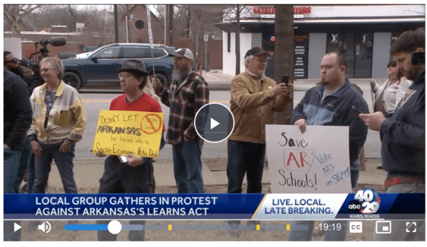 Previous Image Next Image BenP at Education Legislation Rally 022523 Local 965 Vice President Ben Pollock (red shirt) holds a placard at a rally Feb. 26, 2023, opposing a Republican overall reform of Arkansas education policy. Retired 965 board member Ted Swedenburg takes photos of the crowd. Screen grad from 4029 TV
