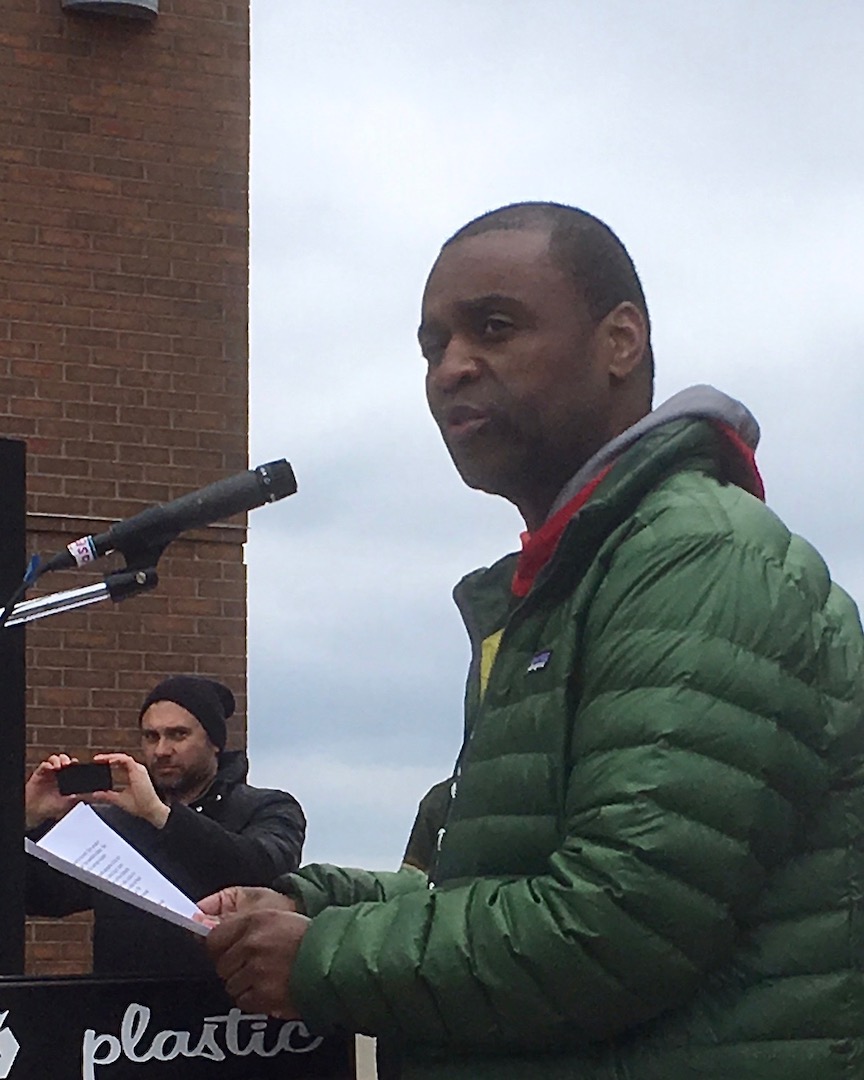 D’Andre Jones, chair of the Fayetteville Civil Rights Commission, discusses the legacy of the Rev. Martin Luther King Jr. at the U of A Living Wage Rally on April 7, 2018, on the Fayetteville Town Center plaza. Jones focused on the legacy of the Rev. Martin Luther King Jr.