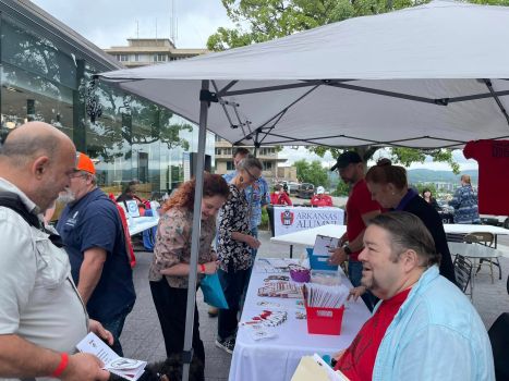 Previous Image Next Image Good crowd at 051723 UA Staff Appreciation Picnic As University of Arkansas employees look at brochures, Local 965 President Hershel Hartford (light blue shirt) talks with a staff employee at the May 17, 2023, University of Arkansas Staff Appreciation Picnic at the 1021 Food Hall. AEA photo