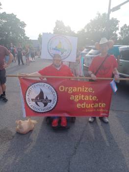 Previous Image Next Image Hershel Ben holding banner 062323 Trans March. Local 965 President Hershel Hartford (left) and Vice President Ben Pollock line up for the June 23, 2025 NWA Trans March. Photo by Chad Kieffer