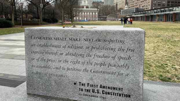 Previous Image Next Image Independence Hall and First Amendment 031625 1920×1080 Monument to First Amendment across from Independence Hall in Philadelphia. Photo by Ben Pollock March 16, 2025