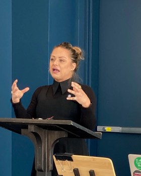 Previous Image Next Image Jessica Akers president Arkansas AFL-CIO 040823 Jessica Akers, president of the Arkansas AFL-CIO, speaks at the April 8, 2023, NWA Labor Spring Teach-In at the Fayetteville Public Library. Mike Pierce photo