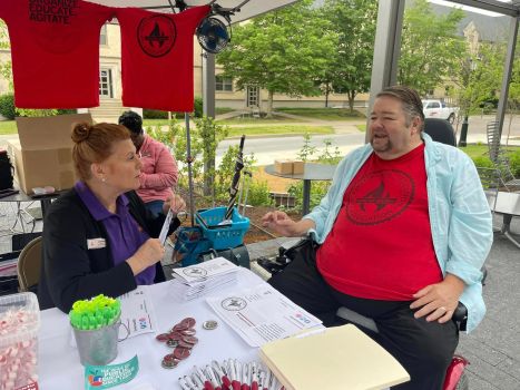 Liz Piccone, interim executive director of the Arkansas Education Association, talks May 17, 2023, with Local 965 President Hershel Hartford at the University of Arkansas Staff Appreciation Picnic at the 1021 Food Hall.
