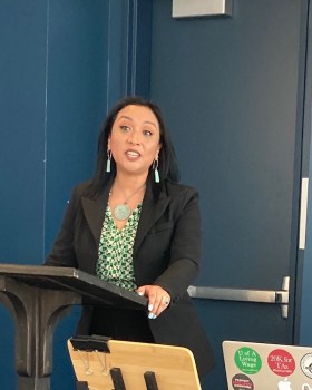 Magaly Licolli, executive director and co-founder of the poultry worker organization Venceremos, speaks at the April 8, 2023, NWA Labor Spring Teach-In at the Fayetteville Public Library.