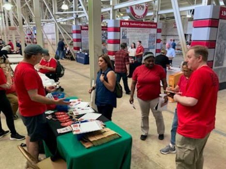 Previous Image Next Image Mike Hershel 3 staffers Chad Local 965 Vice President Mike Pierce talks across the table with a U of A staff member May 19 at the 2022 Staff Appreciation Picnic at Reynolds Razorback Stadium. At-large Board Member Chad Kieffer answers questions of two other staff employees.