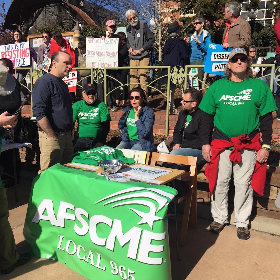 Previous Image Next Image mike ted kelly bret steve 012018 1080×1080 Mike Pierce (from left), Ted Swedenburg, Kelly Hammond, Bret Schulte and Steve Boss manage the Local 965 information table Jan. 20 at the Fayetteville Women’s March 2018, at the downtown square. Photo, Betty Martin