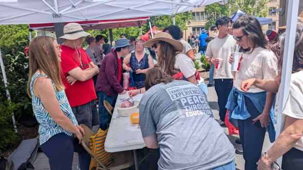 Local 965 board members Rachel Piontak (from left) and Michael Pierce and 965 Vice President Ben Pollock take questions from University of Arkansas staff workers May 14 at the 2025 Staff Appreciation Picnic on the Fayetteville campus. Photo by Summer Lollie