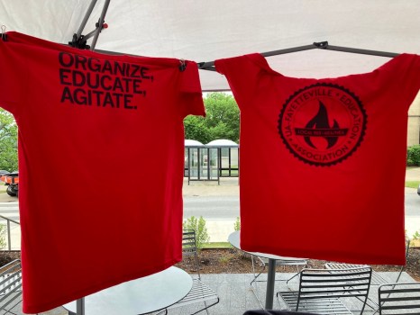 Previous Image Next Image T-shirts at 051723 Staff Appreciation Picnic Local 965 logo Ts are displayed at the 2023 University of Arkansas Staff Appreciation Picnic, May 17 at the 1021 Food Hall. photo by Bret Schulte