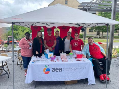 From left, AEA Aspiring Ed and ESP organizer Kelly Givens; AEA UniServ Rep Renee Johnson; 965 Past President Bret Schulte; interim AEA Executive Director Liz Piccone; 965 Secretary Kasey Walker; AEA President Carol Fleming; and 965 President Hershel Hartford. They ran the booth of the Arkansas Education Association and UA-Fayetteville Education Association/Local 965 at the 2023 University of Arkansas Staff Appreciation Picnic, May 17 at the 1021 Food Hall.